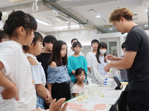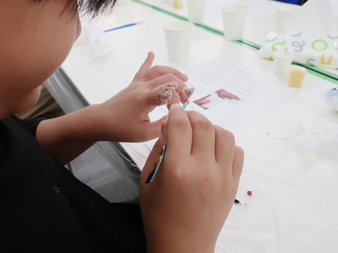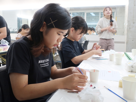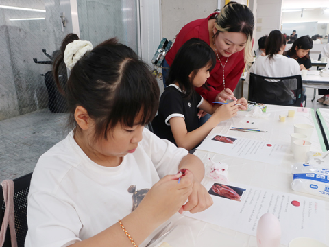 - 先生や学生さん達から優しく丁寧に教えて頂けて、ありがたいと思いました。自分の子どもだけでなく、他の子ども達もみんなが真剣に授業を受けていたのも良かったです。本格的でした‼(帰りの電車で向かいの方が、(うちの子の特殊メイクを見て、)とてもビックリされていました。(小6女子)