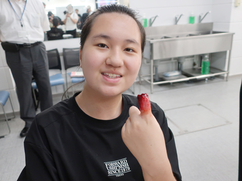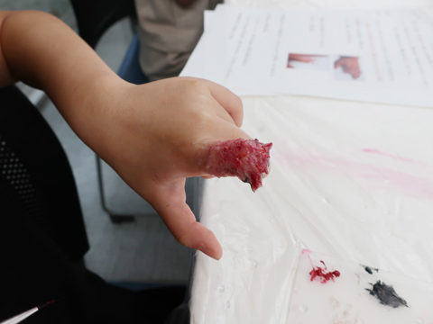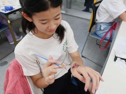 - 私は特殊メイクを初めてやりました。なので、血のりを初めて知りました。血のりをつけたらすごくリアルになったので、すごいと思いました。(小4女子)