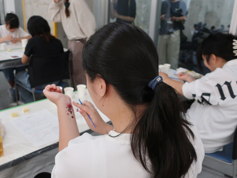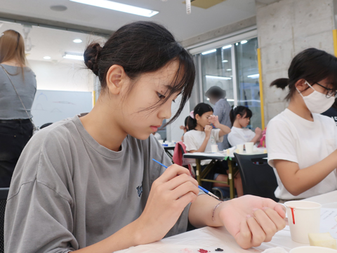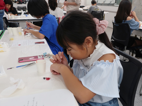 - 先生や学生さん達から優しく丁寧に教えて頂けて、ありがたいと思いました。自分の子どもだけでなく、他の子ども達もみんなが真剣に授業を受けていたのも良かったです。本格的でした‼(帰りの電車で向かいの方が、(うちの子の特殊メイクを見て、)とてもビックリされていました。(小6女子)