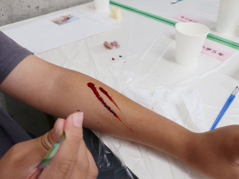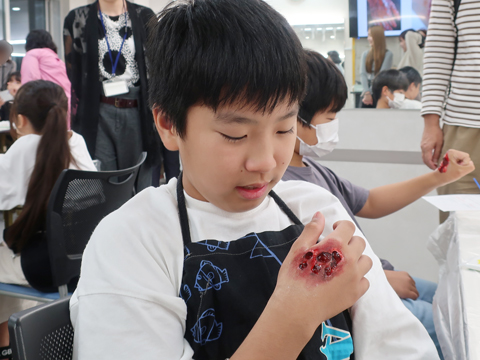 - 私は特殊メイクを初めてやりました。なので、血のりを初めて知りました。血のりをつけたらすごくリアルになったので、すごいと思いました。(小4女子)