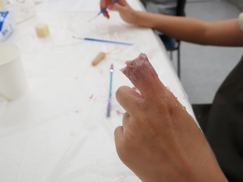 - 特殊メイクを知れて良かったです。特殊メイクはグロい感じのユニバとかのゾンビなどと思っていたけど、食べ物や看板も作っていてびっくりしました。(小4女子)